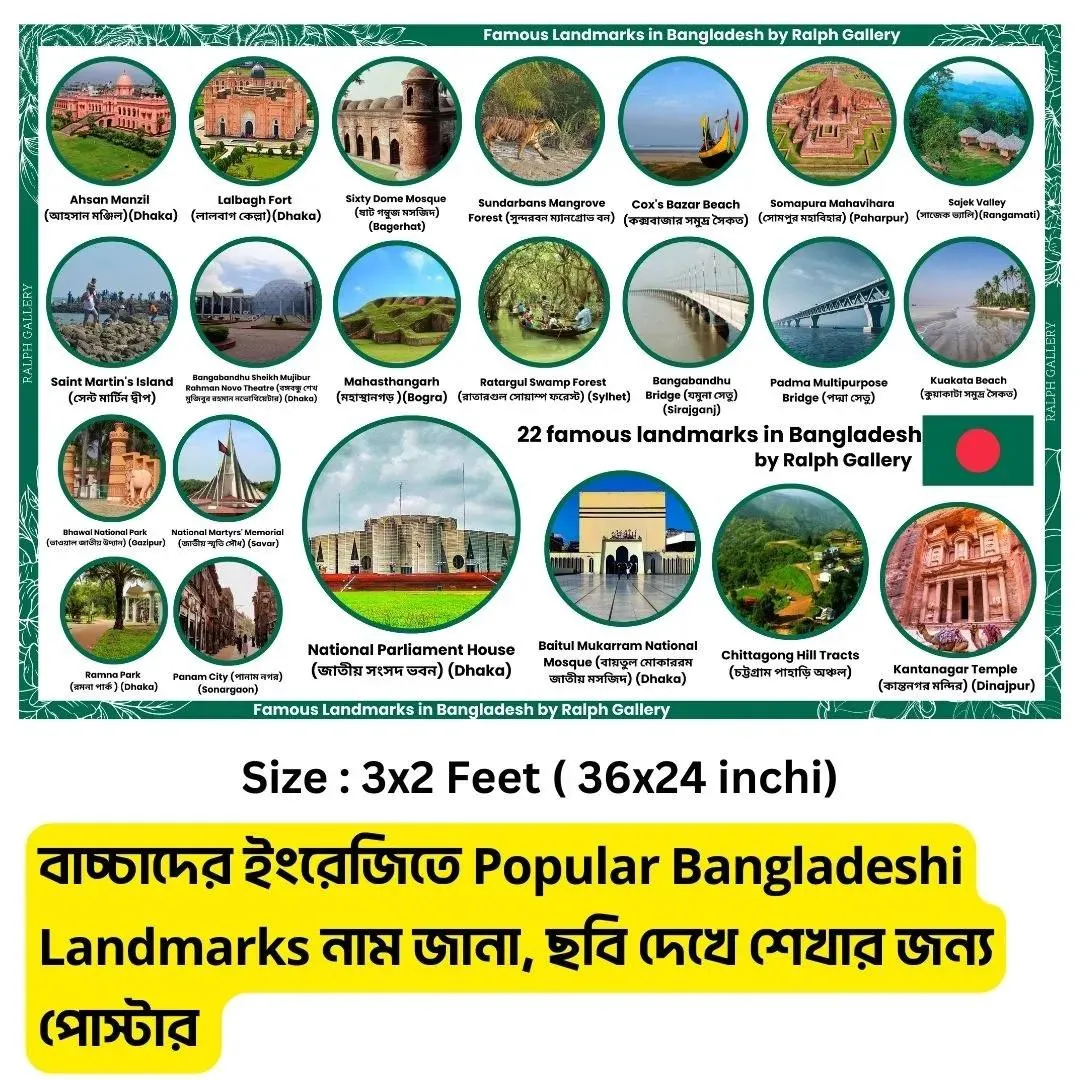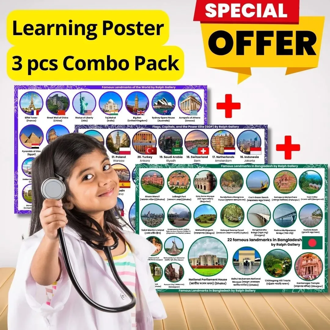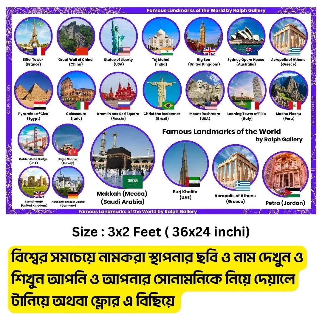 3 pcs Combo Pack Bangladeshi World Landmarks, Capitals জানা, ছবি দেখে শেখা 3×2 Feet Learning Poster Floor Mat